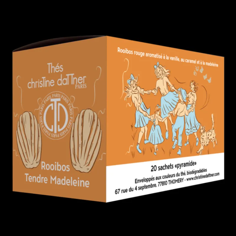 Tendre Madeleine est un rooibos rouge aromatisé à la madeleine, au caramel et à la vanille. Un retour en enfance plein de gourmandise !
